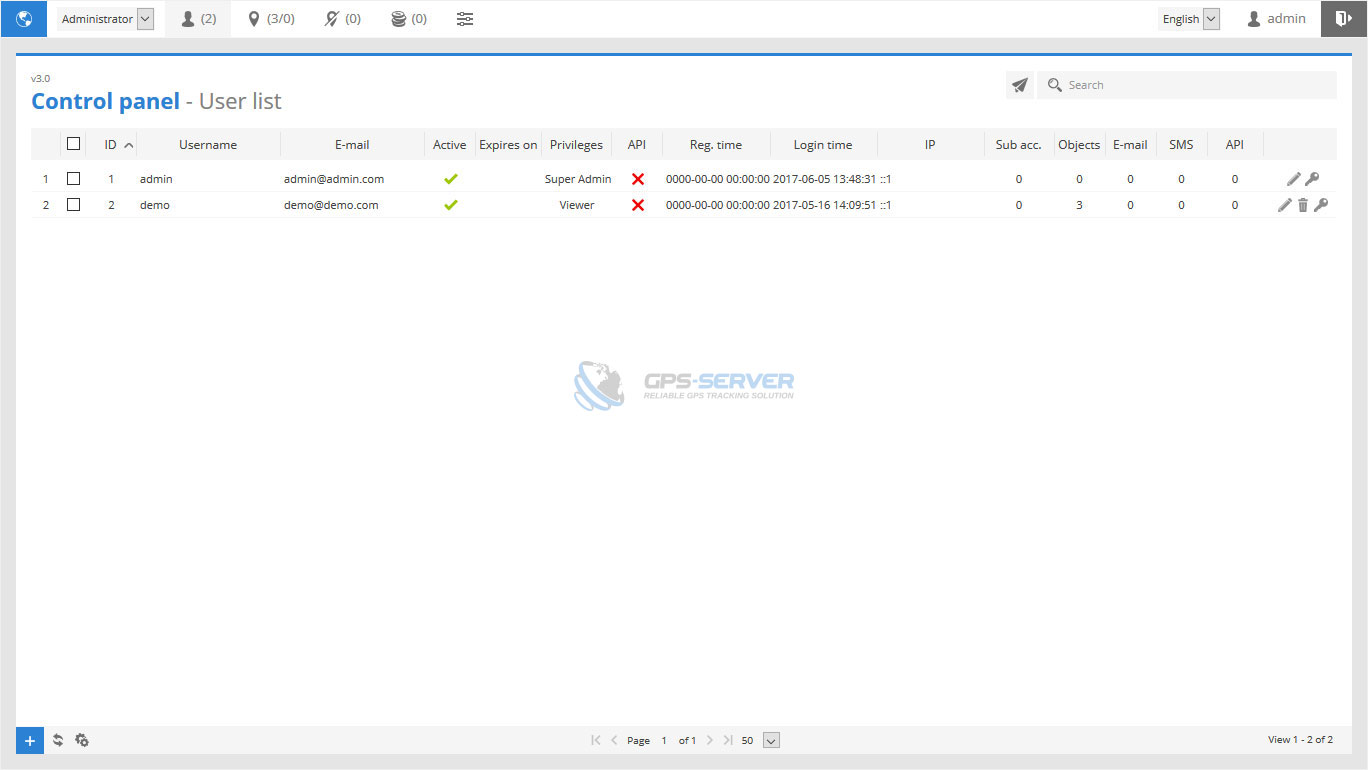 Control panel allows to manage users, objects and most software settings. You are free to add/edit users, change user privileges, add/edit objects, set object expiration dates, change server name/logo, set billing and e-mail settings.