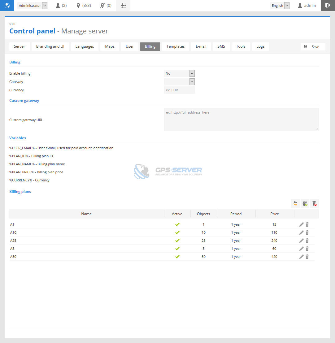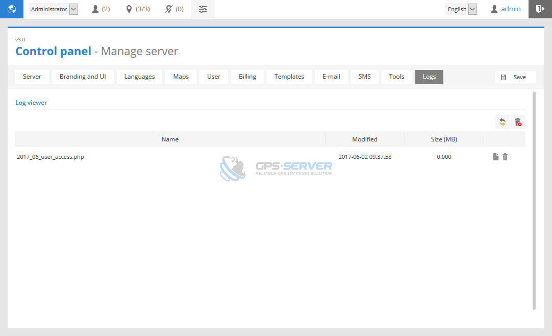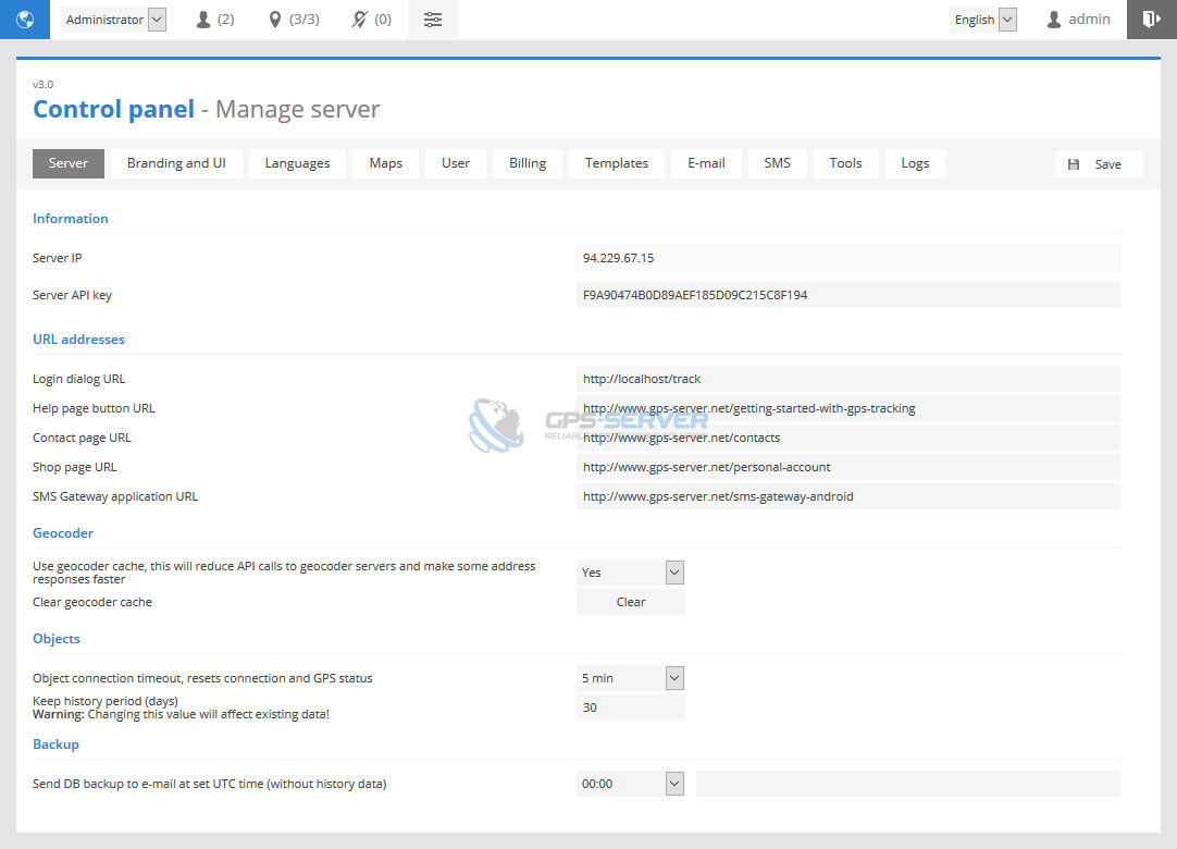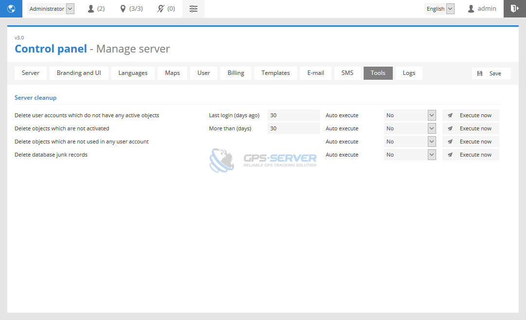 This section allows to clean unnecessary GPS server data. Auto execute feature will perform task once a day.