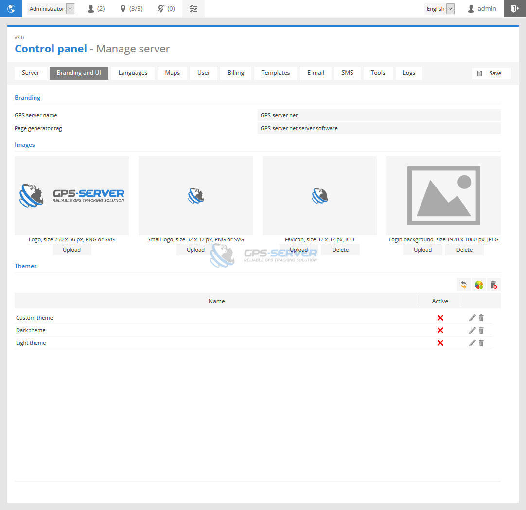 Branding and UI section allows to change server logo, favicon, background image of login page, create custom presets with different design colors.