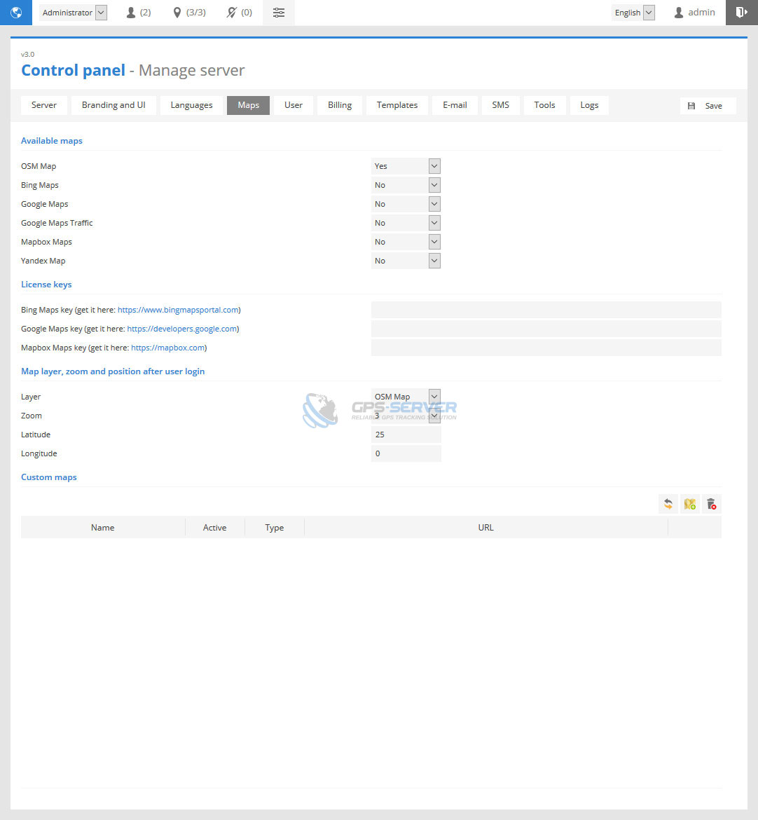 This section allows to choose maps which will be available in front-end, add custom TMS and WMS maps and set default map zoom level and coordinates.
