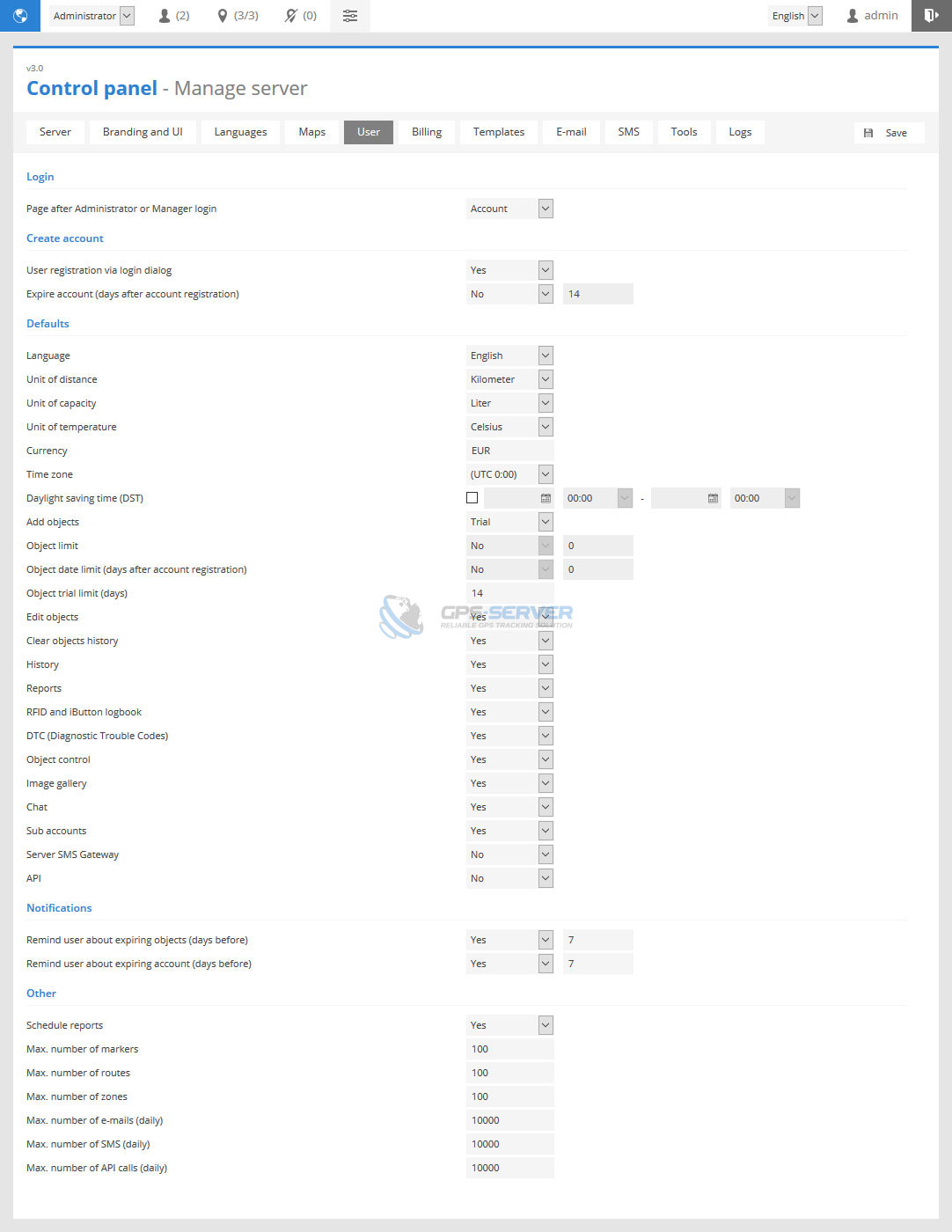 - Max. number of routes - limit routes for all users, also limit can be set for each user separately in Control panel edit user page.