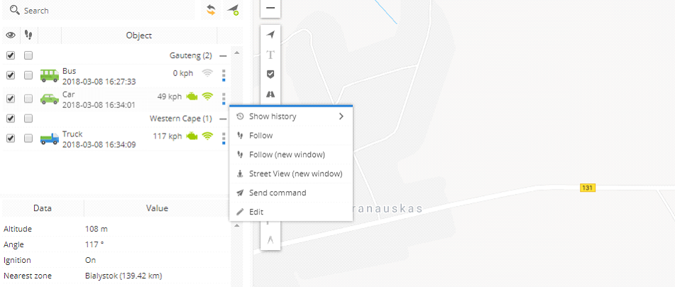 GPS tracking device can be controlled remotely using Object control. This section allows to send commands to GPS device. Click object options icon as shown below. Visit Object control section for more details about this option.
