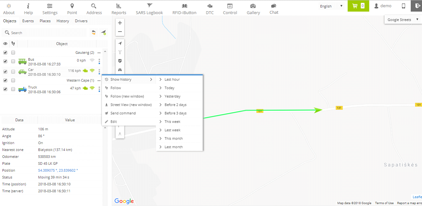 History section allows to see object history at chosen period of time. Click object options icon as shown below.