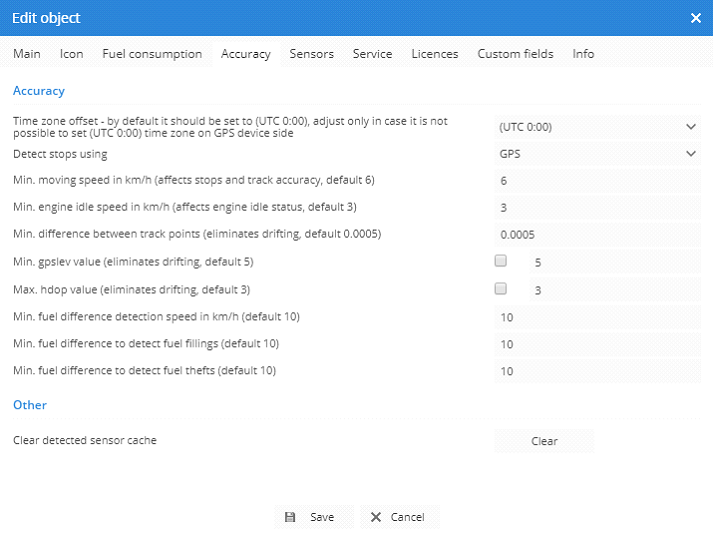 In edit object window click on Accuracy tab. This section allows to accurately adjust GPS device data.