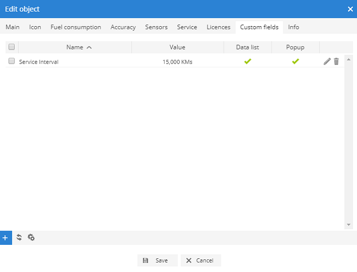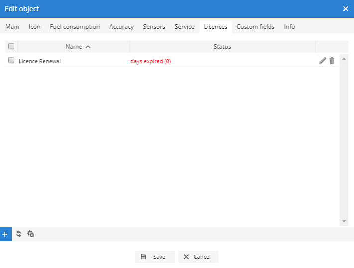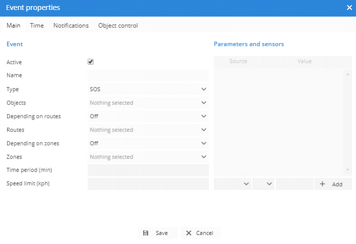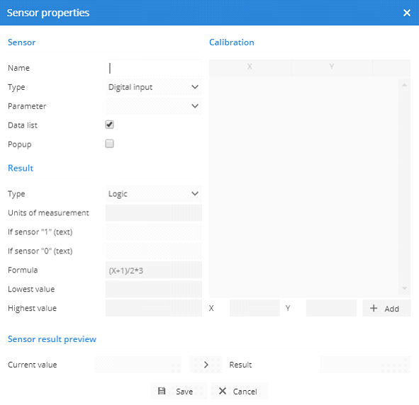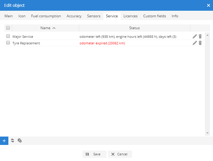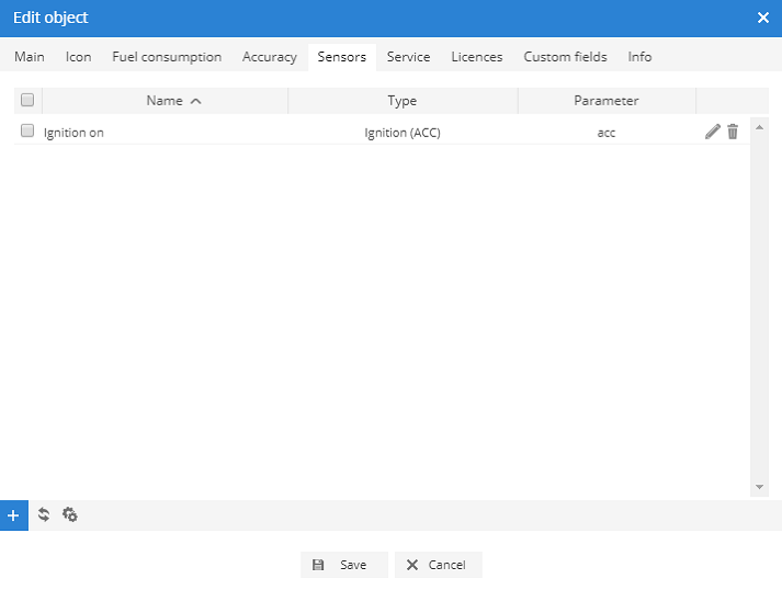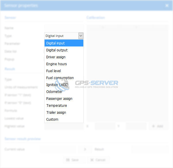 Sensors section allows to add GPS device sensors and assign them to objects. There are many types of sensors which can be widely used. When configuring sensor, the choice of sensor type depends on device model and its principle of operation. For more details refer to GPS device user manual.