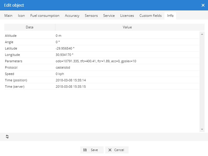 - Time (server) - In object list panel last communication time between GPS device and server will be show.