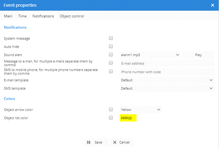 - SMS to mobile phone - sends event message via SMS. Note: SMS gateway must be configured.