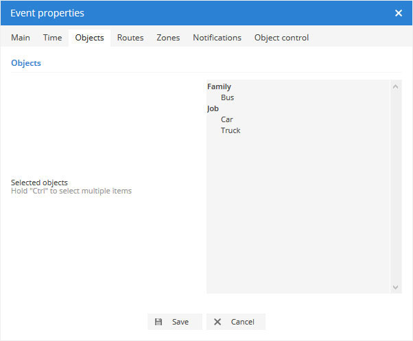 - Selected objects - select object for which event is created. To select multiple objects keep "Ctrl"button pressed.