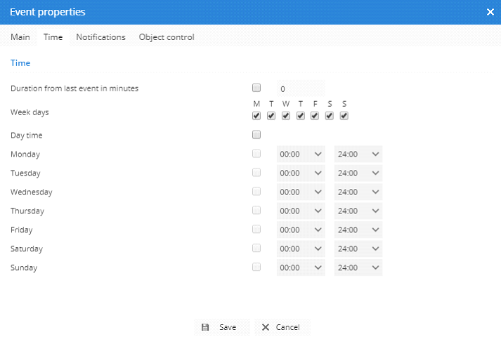 - Duration from last event in minutes - next event will be triggered only after set period of time.