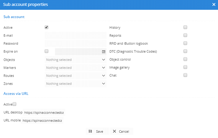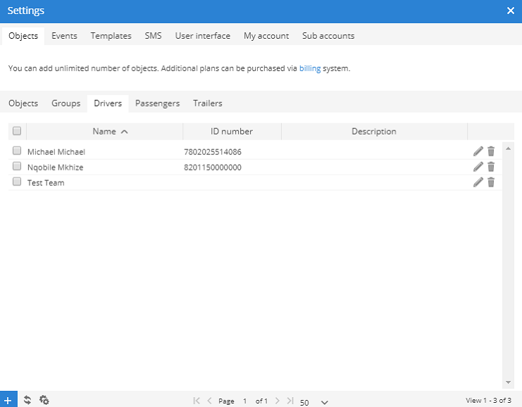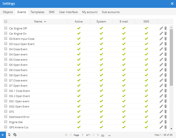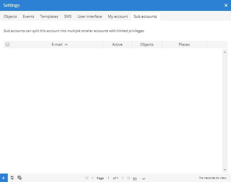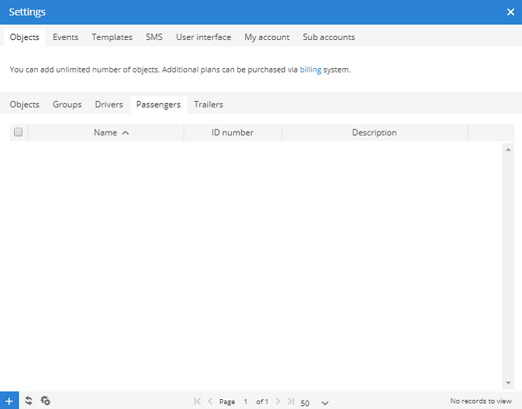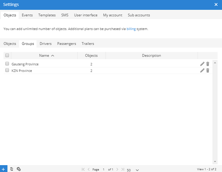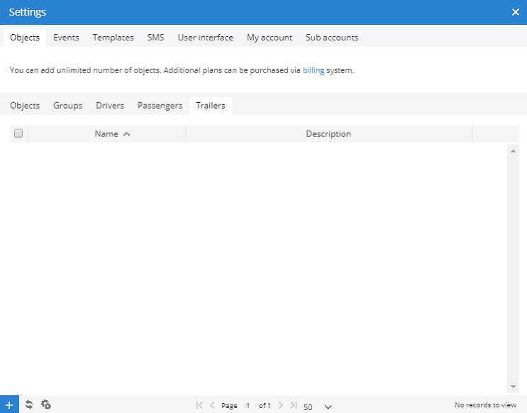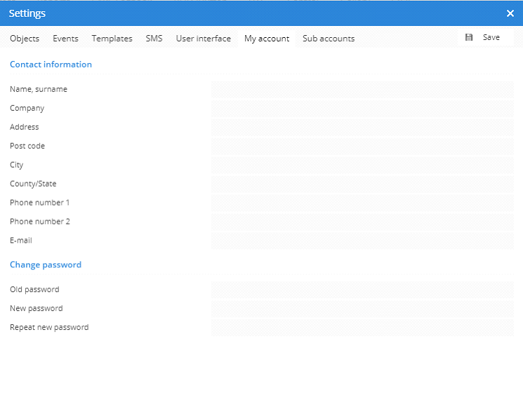 Main functionality located in settings section - add, edit, duplicate objects and related elements, add object groups, drivers, sensors, events. Set up user interface and create sub accounts.