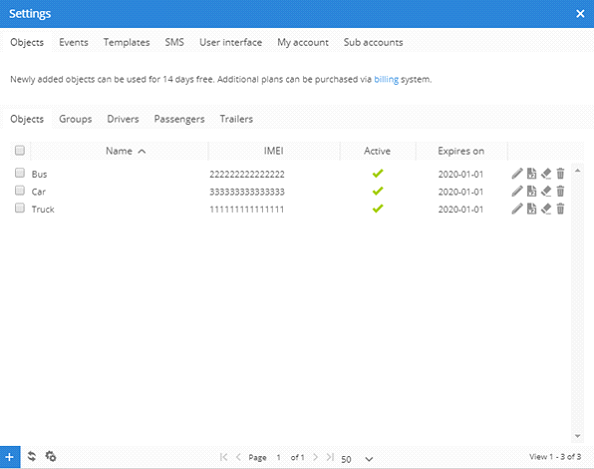 In objects section all account objects are listed, object IMEI, expiration date and object control features.