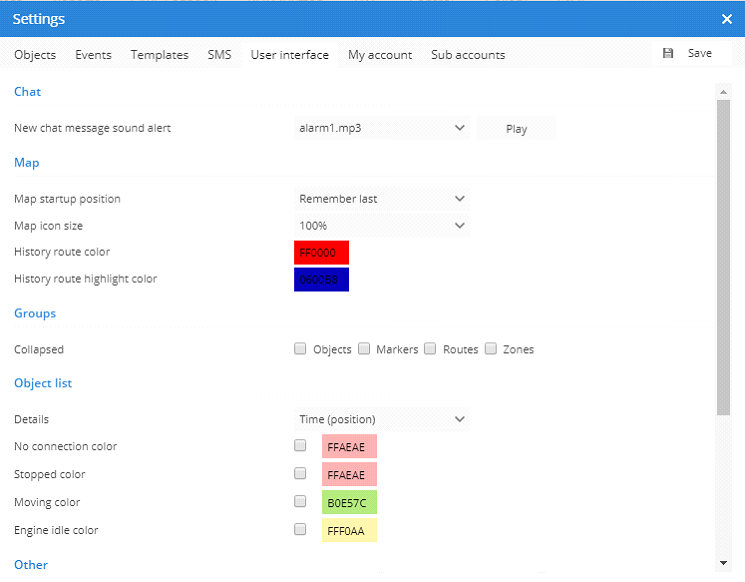 User interface section allows to set various map settings, interface language, measurement units, time zone, etc...