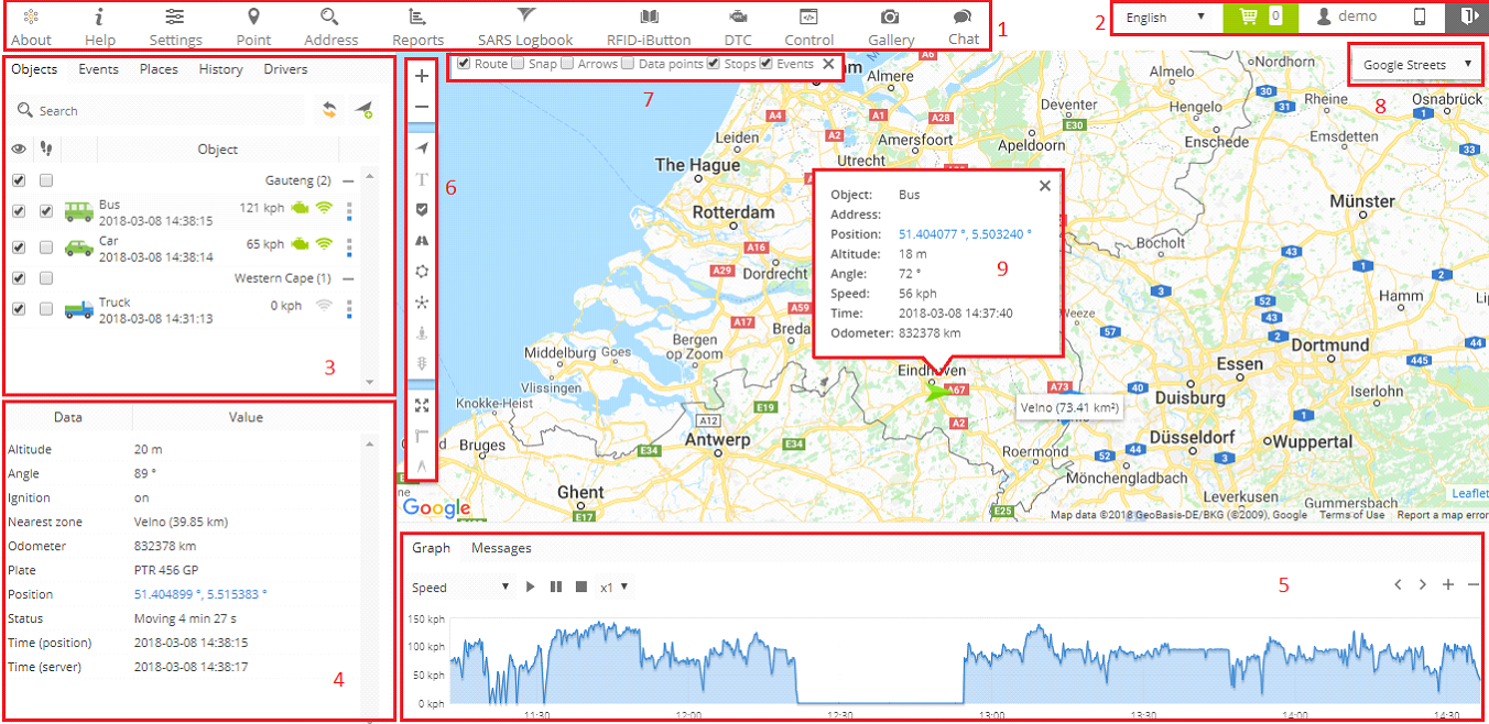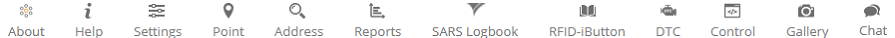 - Top panel - this panel provides access to: Help, Settings, Show point, Search address, Reports, Logbook, DTC, Object control, Image gallery and Chat.