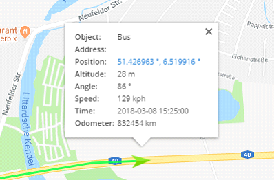 Map shows GPS tracker location (learn more about object configuration). To see more details about object, such as address, speed, altitude, angle, time and more, click on object in object list panel.