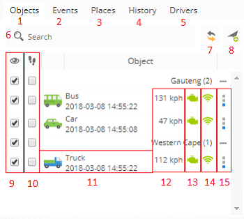 - Left panel - this panel provides access to: Object list, Events, Places (Markers, Routes and Zones) and History.